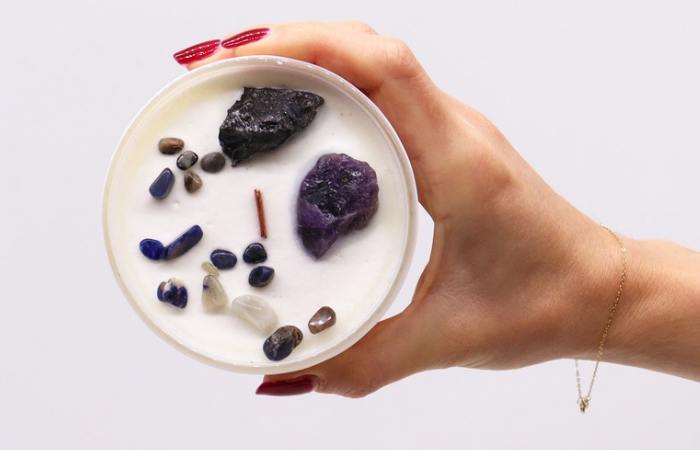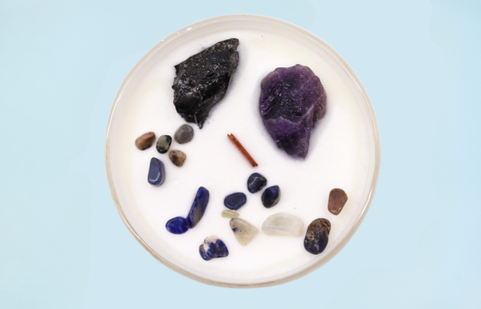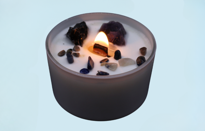 Each candle is adorned with Amethyst and Black Agate – a powerful pairing for cultivating resilience, calm focus, and inner authority.