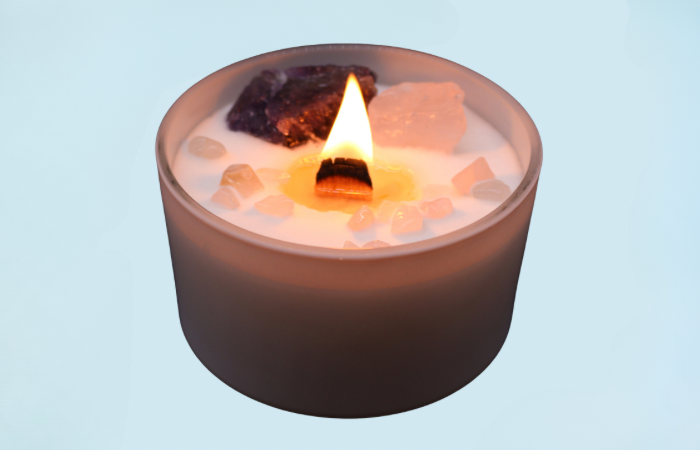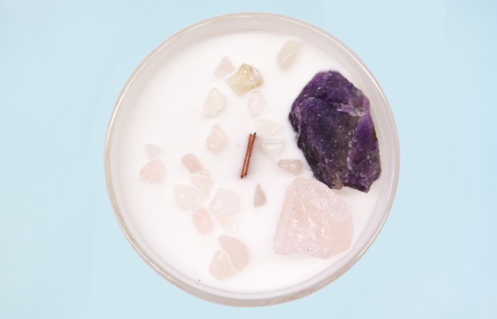 Each candle is adorned with Amethyst and Rose Quartz, two gentle yet powerful stones that support inner clarity and emotional harmony.