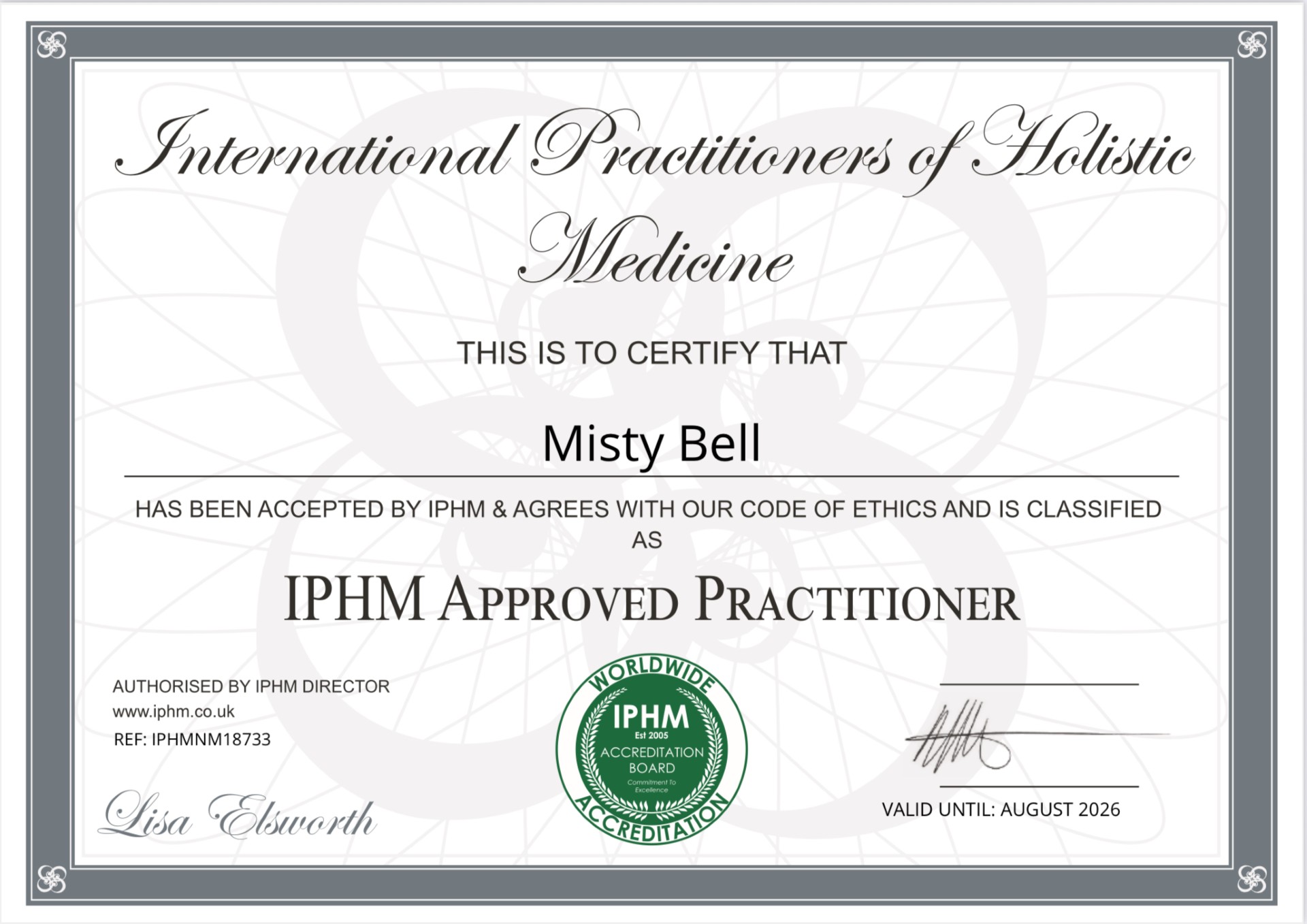 IPHM Approved Practitioner (Ms Misty J B Bell IPMH) APPROVED PRACTITIONER: IPMH (International Practitioners of Holistic Medicine)